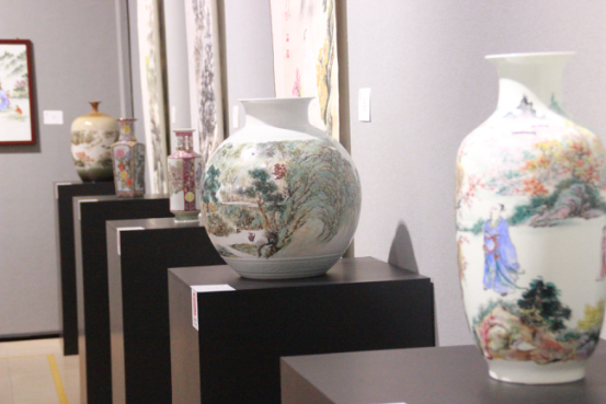 劉致遠(yuǎn)作為國(guó)畫、廣彩陶藝大師劉群興之子,也自幼隨父學(xué)習(xí)國(guó)畫及陶瓷制作,其廣彩作品色澤鮮明,絢麗多彩,既師吸收統(tǒng)繪畫技法,又仿造西洋畫法,頗具嶺南畫派折衷中西的精髓。其國(guó)畫松樹題材的創(chuàng)作,盡顯崇山峻嶺之中,松之勁峭與水之嫵媚,其繪制的山水題材彩瓷既有山河磅礴之態(tài)勢(shì)、又具匠心細(xì)刻之精致。此次兩位嶺南畫派傳承人在此展出他們的作品,內(nèi)容、風(fēng)格各異,交相輝映,很好地承傳了嶺南畫派的要義。