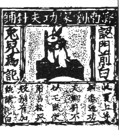 在中國國家博物館,陳列著一塊北宋年間“濟南劉家功夫針鋪”用來印刷廣告的銅雕版,其長12.4厘米,寬13.2厘米,畫面正中是一只站立搗藥的白兔,左右注明“認(rèn)門前白兔兒為記”,這是在告訴買家“一定要認(rèn)準(zhǔn)本店的白兔搗藥商標(biāo)進行選購”;白兔下方廣告文辭稱:“收買上等鋼條,造功夫細(xì)針,不誤宅院使用。轉(zhuǎn)賣興販,別有加饒,謂記白”,意思是說:“我們家用最好的原材料,花費功夫造針,使用方便。如果有人想批發(fā)轉(zhuǎn)買,還可以優(yōu)惠,但要告訴買者或注明是白兔牌的產(chǎn)品”。這件“濟南劉家功夫針鋪”銅雕版是已知世界上最早出現(xiàn)的商標(biāo)廣告實物。宋代使用銅版印刷的廣告,既可以做產(chǎn)品的包裝,也可以做廣告招貼的海報或者傳單,這種紙單在宋代叫“仿單”或“裹貼”。