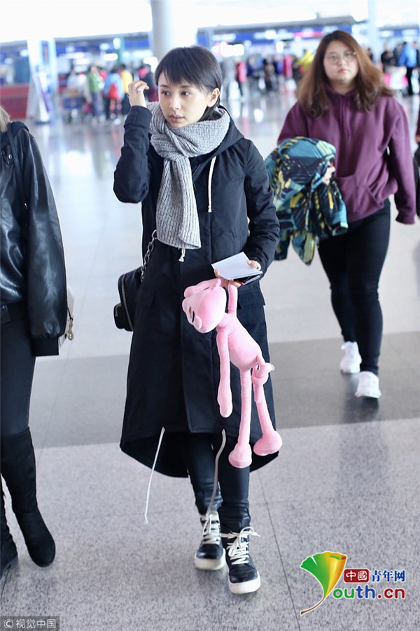 2017年12月10日,北京,王子文現(xiàn)身機場,裹圍巾羞澀撓頭,少女感十足,提溜粉絲所贈“粉紅豹”童心未泯。
