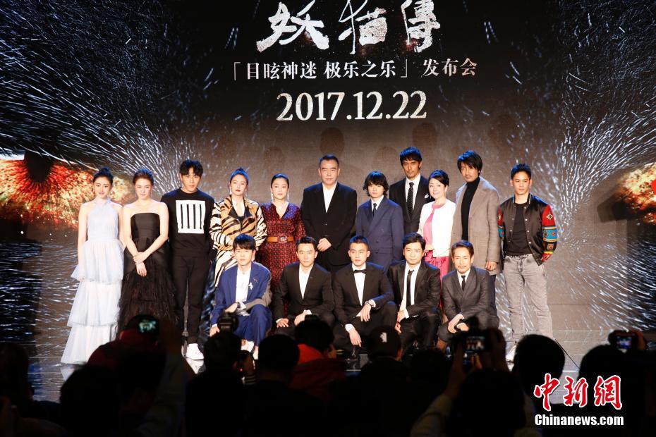 12月17日,由陳凱歌導(dǎo)演的賀歲奇幻題材電影《妖貓傳》在北京舉行全球首映發(fā)布會(huì),導(dǎo)演陳凱歌,制片人陳紅攜主演黃軒、染谷將太、張雨綺、秦昊、張榕容、張魯一、劉昊然、阿部寬、松坂慶子等亮相。影片改編自日本作家夢(mèng)枕貘的魔幻系列小說(shuō)《沙門空?!罚瑢⒂?2日起在中國(guó)內(nèi)地上映。圖為眾主創(chuàng)合影。
