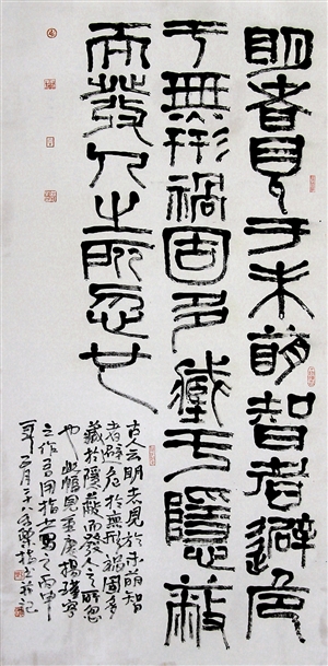 至于手指用墨與毛筆的區(qū)別,王和平說:“指書可以表現(xiàn)得比較拙,有刀刻的味道。我寫《好太王碑》,就是因為可以從這個碑里領(lǐng)會一些傳統(tǒng)的東西。再一個就是有很多指書的字像漢磚里面的老痕跡,金石味比較濃?!?/p>