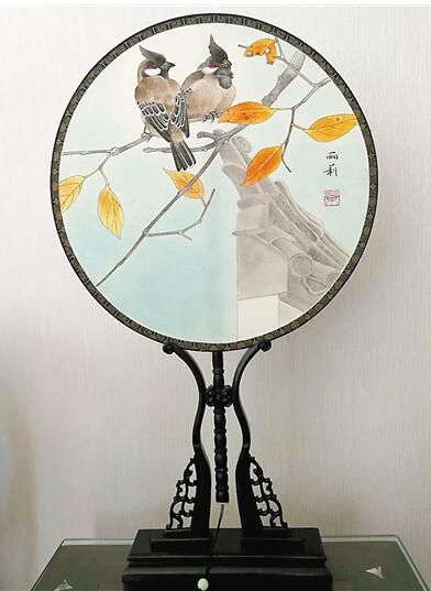 景麗莉創(chuàng)作的團(tuán)扇《晨鳥飛啼棲枝頭》。