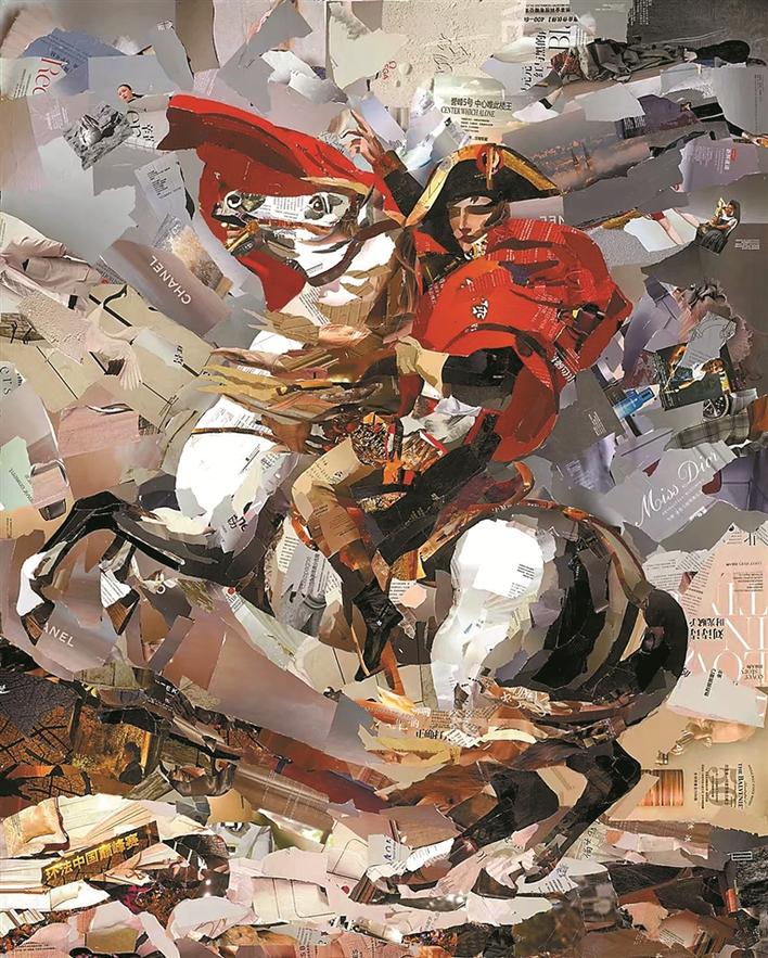 畫(huà)家黃鳳榮和他的拼貼名畫(huà)《跨越阿爾卑斯山圣伯納隘道的拿破侖》。