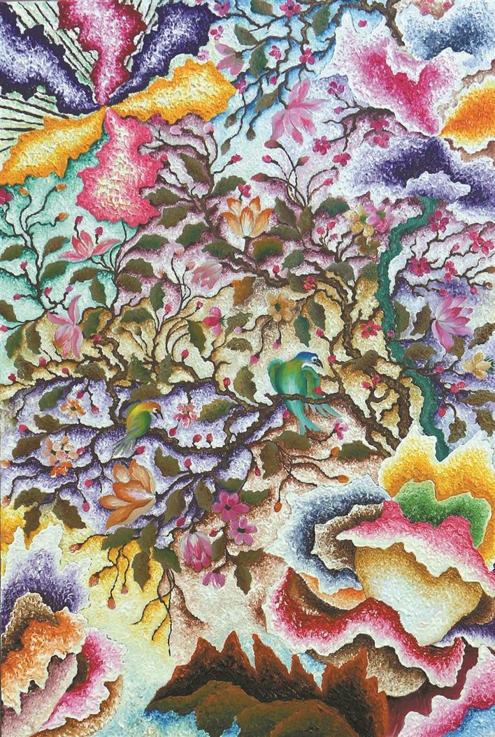 色彩是鄭澤生作品的一大亮點。這源自他第一份工作是在深圳增邦印花廠學調(diào)色,長期的訓練和刻苦的努力練就了他對色彩的敏感度?!断诺南愀窭锢愤@組作品可以說是他近期創(chuàng)作中布局最為精細、顏色最為豐富的代表作之一。畫面布滿圖騰式的形象,萬物共生。此時鄭澤生處理群像時顯現(xiàn)出一派欣欣向榮的景象,每一寸都散發(fā)著生命的光輝和絢爛。