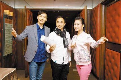更新版《百花亭贈(zèng)劍》的編劇江駿杰(中)與男女主角王志良(左)、林穎施(右)