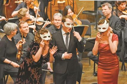 經(jīng)過(guò)對(duì)歌劇《唐璜》的嚴(yán)謹(jǐn)考證,勒內(nèi)·雅各布斯以鮮活的“古樂(lè)”形式還原了早期古典主義歌劇的音樂(lè)特質(zhì)。據(jù)凱撒介紹,昨晚的演出與以往歌劇表演有很大不同。音樂(lè)會(huì)版的歌劇《唐璜》中,樂(lè)團(tuán)、指揮、獨(dú)唱與合唱團(tuán)都在舞臺(tái)上,演員不僅會(huì)在臺(tái)前演唱,還穿梭在樂(lè)團(tuán)中,帶來(lái)生動(dòng)的演出。