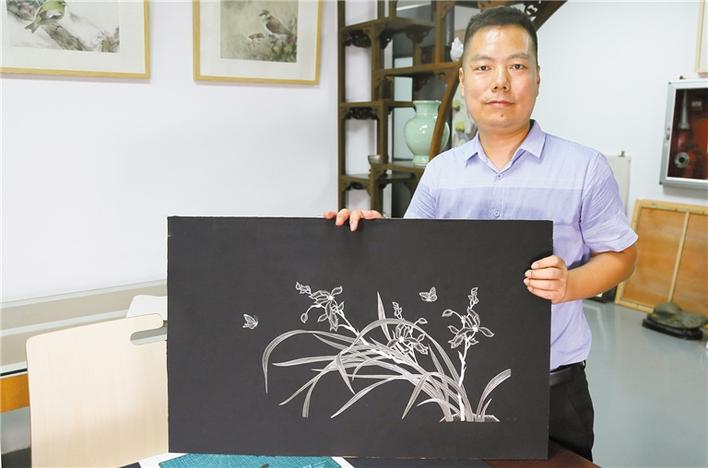 采訪現(xiàn)場,何俊剛向記者展示麥金畫的制作過程。首先是選麥,然后擇優(yōu)挑選,接著刨開、刮平、燙制、分料等,一片片金黃色的麥秸皮就完成了,裝箱備用。隨后,粘貼、書寫、刻制、上色、裝裱再壓光、裝鏡。何俊剛表示,刻制時既要精神集中,全神貫注,又要心平氣和,一絲不茍,心手合一才能把書寫字或畫稿,刻制而成。