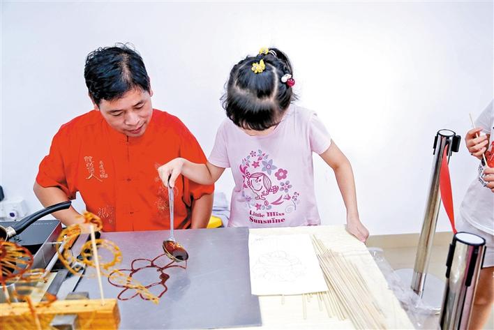 系列活動中最受小朋友歡迎的還要屬糖畫了。糖畫是一種傳統(tǒng)民間手工藝,以糖為材料來作造型的。所用的工具僅一勺一鏟,糖料一般是紅、白糖加上少許飴糖放在爐子上用溫火熬制,熬到可以牽絲時即可用來澆鑄造型了。陪伴小朋友們的家長表示,孩子親自動手制作,既能加深對民間藝術(shù)的認識和濃厚興趣,又能增強動手能力,十分有意義。而小朋友們則認為,不光可以學(xué),還可以吃,真好。