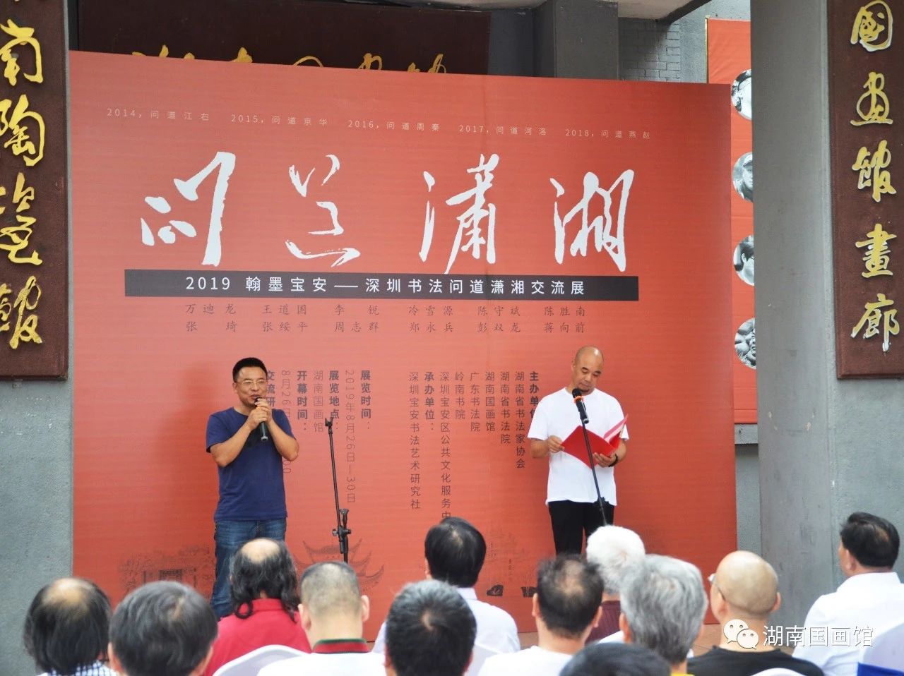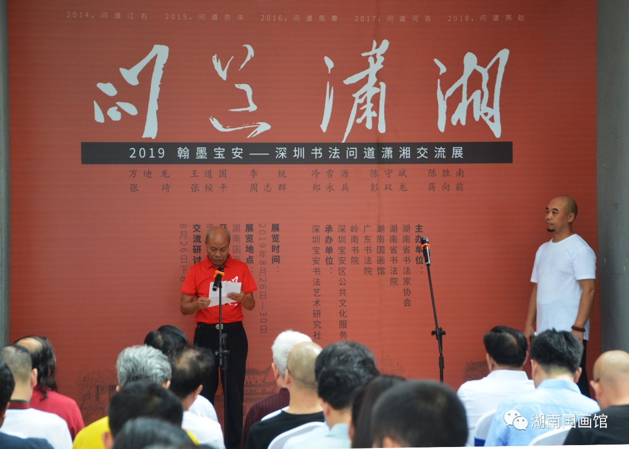 開幕式由湖南省書法家協(xié)會(huì)副主席兼秘書長(zhǎng)胡紫桂主持,湖南省文化和旅游廳副廳長(zhǎng)、湖南省書協(xié)主席鄢福初,湖南國(guó)畫館負(fù)責(zé)人黃作,嶺南書院院長(zhǎng)、深圳寶安書社社長(zhǎng)張琦分別致辭。
