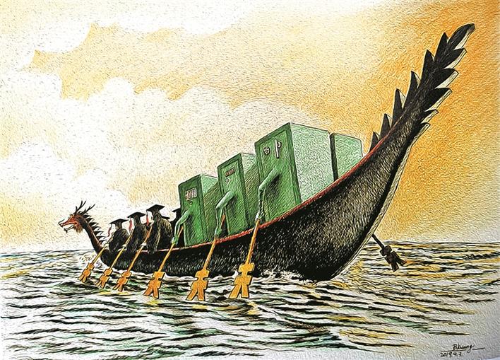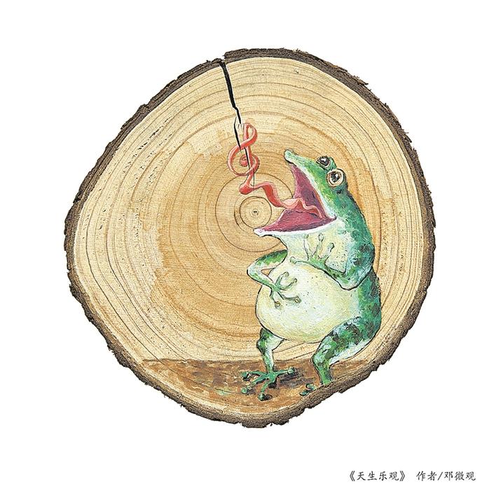 上榜漫畫家鄧微觀系深圳市寶安區(qū)打鐵文藝社社長(zhǎng),其《感物系列》以見物興感為主線,展開豐富的想象力,用動(dòng)物擬人的方式幽默詼諧地抒發(fā)人生感悟,讓人會(huì)心一笑之余引起共鳴,令觀眾感嘆藝術(shù)家的漫無(wú)邊際的“腦洞”。對(duì)于作品首次入選國(guó)內(nèi)美術(shù)界規(guī)格最高的國(guó)展,鄧微觀很興奮:“這是對(duì)我這個(gè)系列作品的高度肯定?!薄陡形锵盗小废盗凶髌吩从谒e逛發(fā)呆時(shí)的想象碎片,將這個(gè)碎片貫穿就成了這個(gè)系列作品。鄧微觀在茶余飯后經(jīng)常到鐵崗的西鄉(xiāng)河邊散步,河中不時(shí)傳來(lái)低頻厚實(shí)的“男低音”引起他的注意,此起彼伏,聽來(lái)如交響曲一般通達(dá)舒暢。他循聲尋覓,原來(lái)是蛤蟆的聲音,只見這些“音樂家”在下水道洞口,在草叢中,河道縫中快樂地歡唱……這些天生的樂觀者給鄧微觀帶來(lái)美妙的心情,所以創(chuàng)作了這幅《天生樂觀》。再如《三餐之余》,有時(shí)飯后經(jīng)常會(huì)在茶幾前發(fā)發(fā)呆,思考人生不應(yīng)該只是面包和蘋果,還應(yīng)有點(diǎn)別的……