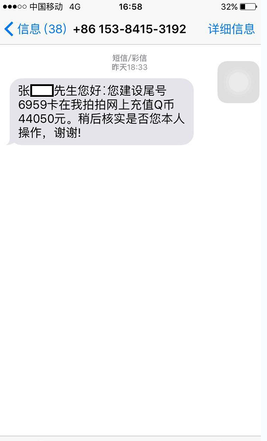 一天,客戶張先生收到一條手機(jī)號碼為15384153192發(fā)來的短信:“張先生您好∶您建設(shè)銀行尾號6959卡在我拍拍網(wǎng)上充值Q幣44050元,稍后核實是否您本人操作,謝謝!”起初,張先生見是陌生手機(jī)號發(fā)來的短信,就并未在意,可隨后卻收到建行95533客服中心發(fā)來的短信提醒,稱他的銀行賬戶發(fā)生了一筆44050元的轉(zhuǎn)賬支取業(yè)務(wù)。