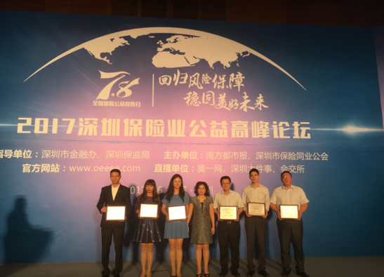 7月6日,“2017深圳保險業(yè)公益高峰論壇”在深圳五洲賓館盛大召開。太平財險深圳分公司榮獲“2017深圳保險業(yè)精準(zhǔn)扶貧先進單位”稱號。