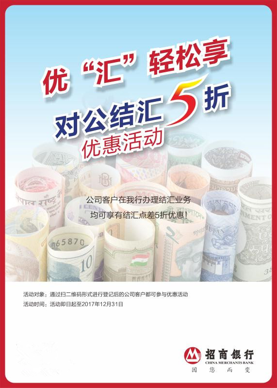 近日,記者從招行深圳分行了解到,自2017年8月1日至2017年年底,招商銀行深圳分行特別推出結(jié)匯尊享優(yōu)惠活動(dòng)。活動(dòng)期間,凡公司客戶,可在招商銀行深圳分行轄內(nèi)(含珠海分行及惠州分行)任一網(wǎng)點(diǎn)通過掃描指定二維碼進(jìn)行登記,登記后辦理結(jié)匯業(yè)務(wù)即可享受結(jié)匯點(diǎn)差五折優(yōu)惠。(張怡)