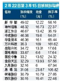 股市中有“三板成妖”一說。截至周四收盤,滬深兩市過去10個交易日,漲幅超過30%的股票有34只;過去5個交易日,漲幅超過30%的股票有15只。以上這些股票里,有一些連續(xù)上漲3個漲停以上,已經(jīng)“成妖”。那么,這些妖股有沒有一些共同點呢? 除少數(shù)次新股如萬興科技之外,絕大多數(shù)這類股票都經(jīng)過了一兩年下跌,股價處于低位,因這樣那樣原因得到資金關(guān)注而強(qiáng)力反彈。比如神州信息、浙江東日、中成股份、岳陽興長、國電南自、國投中魯、西儀股份等。