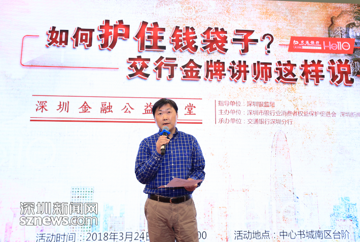 3月24日,在深圳中心書城南臺(tái)階,由深圳銀監(jiān)局指導(dǎo),深圳新聞網(wǎng)、深圳市銀行業(yè)消費(fèi)者權(quán)益保護(hù)促進(jìn)會(huì)主辦,交通銀行深圳分行承辦的大型系列公益活動(dòng)“深圳金融公益講堂”第四講如期開講?;顒?dòng)邀請(qǐng)了來(lái)自交通銀行深圳分行的三位金牌講師從專業(yè)角度為市民朋友們?cè)敿?xì)講解理財(cái)知識(shí),現(xiàn)場(chǎng)解答市民的金融消費(fèi)困惑。