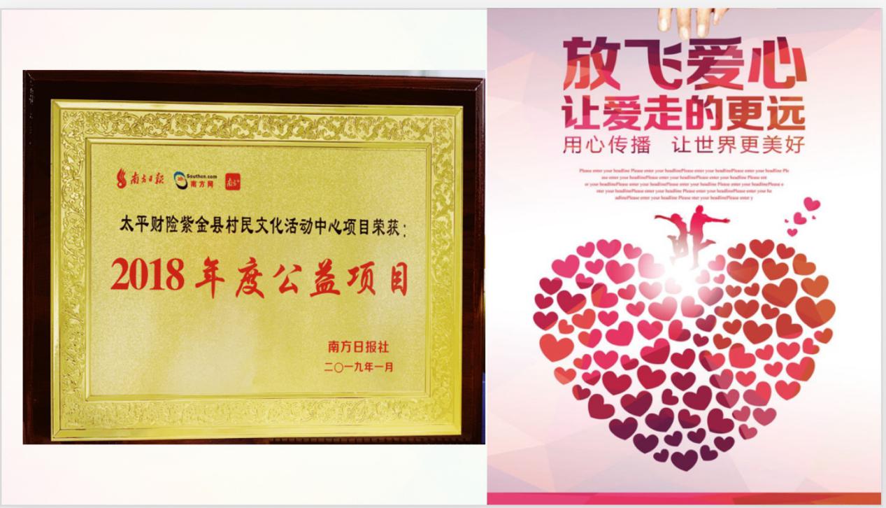 太平財產(chǎn)保險有限公司深圳分公司于2017年捐助紫金縣竹塘村村民文化中心工程,獲得了公益項目獎。太平財險負責人表示,在集團“共享太平”的旗幟下,深圳分公司將繼續(xù)服務實體經(jīng)濟,關注公益活動,助力鄉(xiāng)村振興,有力落實央企責任。