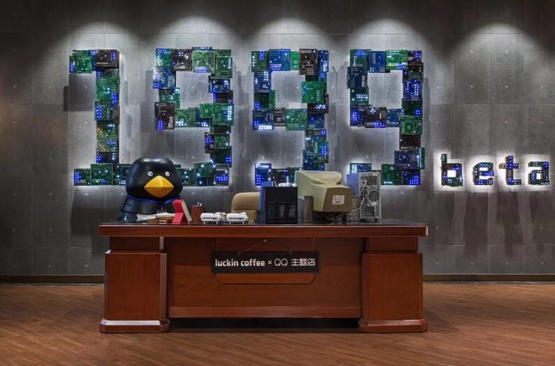 瑞幸咖啡騰訊QQ主題店距離騰訊全球總部所在地濱海大廈不到兩公里??Х鹊瓿錆M互聯(lián)網(wǎng)懷舊特色,擺放著騰訊20年前創(chuàng)業(yè)伊始的第一張辦公桌復刻版,懷舊打卡的立柱上裝飾有充滿時代特色的QQ聊天對話框,在這里還可以聽到復古的QQ提示音。1999年,QQ beta版(測試版)上線,歷經(jīng)多次迭代目前月活用戶達8億,成為全球最大的通訊社交平臺之一。