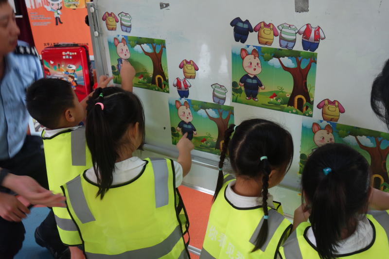 熊警官?gòu)慕煌üぞ咧v起,分別講述了乘坐不同交通工具所帶來(lái)的風(fēng)險(xiǎn)及注意事項(xiàng),并通過(guò)幽默風(fēng)趣的“兒童安全座椅”小視頻,提醒在座的小朋友及家長(zhǎng)要注意細(xì)節(jié),具有防范風(fēng)險(xiǎn)的意識(shí)。在互動(dòng)游戲環(huán)節(jié),熊警官通過(guò)與小朋友們的互動(dòng),講解了紅綠燈的來(lái)源、日常的交通標(biāo)識(shí)以及過(guò)馬路的規(guī)則。現(xiàn)場(chǎng)的同學(xué)們也非常踴躍,在“被看見(jiàn)才安全”環(huán)節(jié)時(shí),許多小朋友主動(dòng)上臺(tái),給小兔子穿上最亮最顯眼的衣服,使其成為最靚的仔。