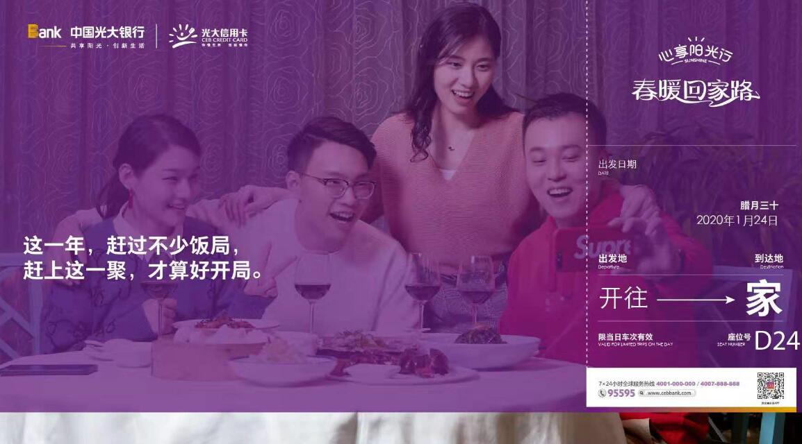 此次“春暖回家路”活動將在全國多地同步開展,圍繞餐飲、出行、娛樂等多種春節(jié)期間關鍵場景,光大信用卡推出十余個優(yōu)惠活動,包括國內(nèi)機票優(yōu)惠立減、旅游線路優(yōu)惠立減、10元購50元飯票、18元購50元滴滴專車權益包、口碑優(yōu)惠滿減、口碑APP滿額減等?;顒又攸c從“回家路途”延伸到“回到家后”,涵蓋團圓、走親訪友等各類場景,其中針對年夜飯場景特別推出新春主題榜單、藏寶小鎮(zhèn)兌紅包、餐飲主題快閃店三大核心玩法。此外,2020年是全面建成小康社會的決勝之年,“擁軍愛國送溫暖”等公益行動同步開展,讓“關愛”“正能量”成為2020年春節(jié)的關鍵詞。