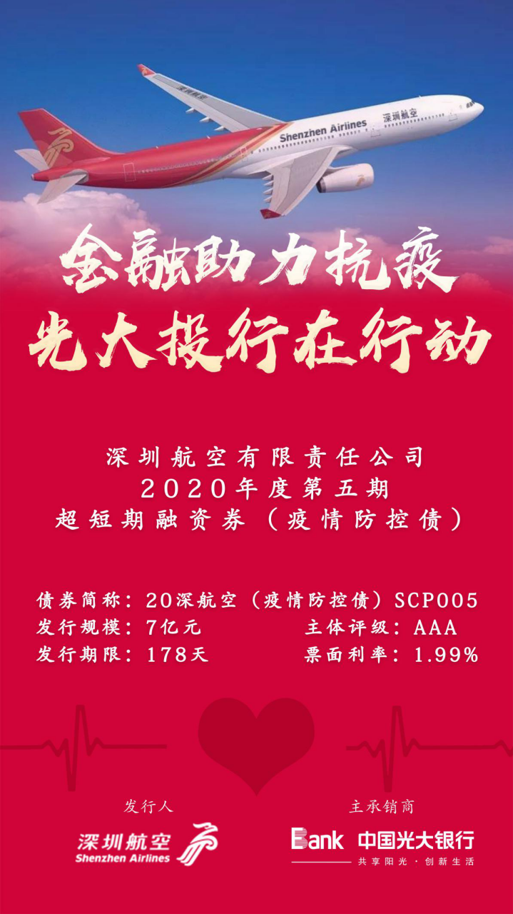 深圳新聞網2月12日訊 為積極響應國家抗疫號召,支持疫情防控企業(yè)債券融資,光大銀行總行戰(zhàn)投部和深圳分行迅速反應,堅決貫徹落實光大集團及光大銀行總行黨委關于新型冠狀病毒肺炎疫情防控的有關要求,于2月11日成功發(fā)行深圳航空有限責任公司2020年度第五期超短期融資債券(疫情防控債) ,發(fā)行規(guī)模7億元,期限178天,票面利率僅為1.99%。其中,2億元募集資金將用于補充深圳航空為旅客免費辦理退票、改期等支出產生的營運資金需求以及免費提供防疫物資、醫(yī)療人員等運輸產生的營運資金需求。