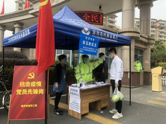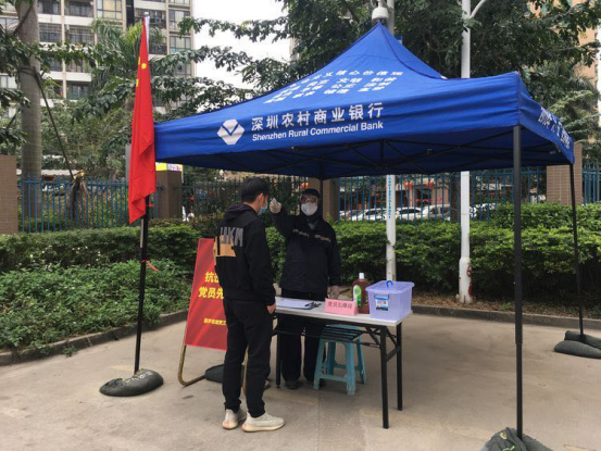隨著疫情防控形勢(shì)的發(fā)展,深圳各街道各社區(qū)都不斷加強(qiáng)疫情防控,在道路口、社區(qū)出入口、樓棟出入口對(duì)進(jìn)出車輛和人員進(jìn)行篩查。在燕羅街道、松崗街道轄內(nèi)的道路卡口、社區(qū)門口、街道養(yǎng)老院、工廠等防疫檢查站點(diǎn),記者看到很多印有深圳農(nóng)商行名稱的藍(lán)色帳篷。一頂頂帳篷就像一把把‘保護(hù)傘’,為防控工作人員提供了遮風(fēng)擋雨的場所,也守護(hù)著轄區(qū)居民的健康。