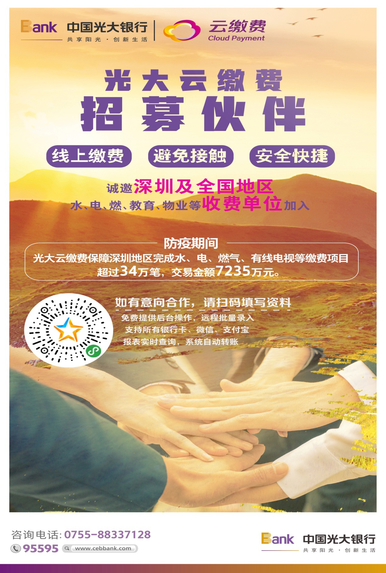 見圳客戶端·深圳新聞網(wǎng)2月26日訊 守望相助,共克時(shí)艱。面對新型冠狀病毒疫情防控的緊張形勢,為有效阻斷病毒傳播渠道,光大銀行深圳分行積極響應(yīng)國家號(hào)召,充分發(fā)揮云繳費(fèi)線上便民繳費(fèi)服務(wù)優(yōu)勢,全力保障全國,特別是重點(diǎn)地區(qū)水、電、燃等主要生活繳費(fèi)線上通道穩(wěn)定暢通運(yùn)行,足不出戶,完成各類繳費(fèi),最大限度降低了居民的出行風(fēng)險(xiǎn),全面助力打贏“防疫”阻擊戰(zhàn)。