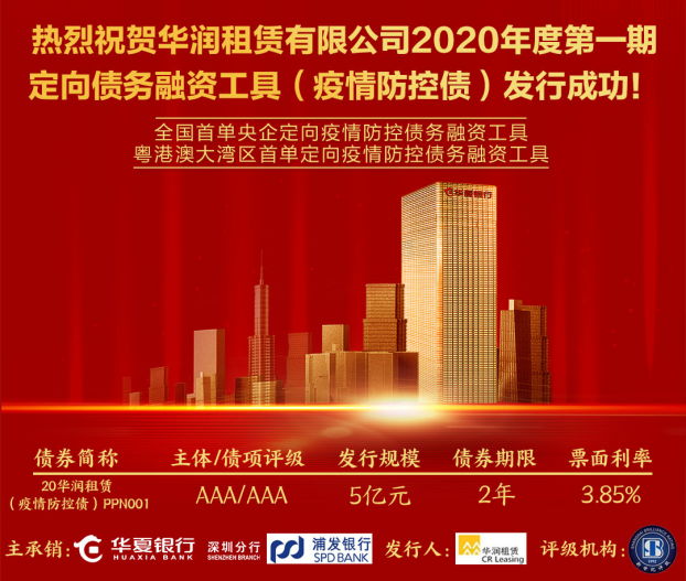 深圳新聞網(wǎng)2月29日訊 2月28日,由華夏銀行深圳分行主承銷的華潤租賃有限公司2020年度第一期定向債務(wù)融資工具(疫情防控債)成功發(fā)行,該債券是全國首單央企疫情防控定向債務(wù)融資工具,也是粵港澳大灣區(qū)首單疫情防控定向債務(wù)融資工具。