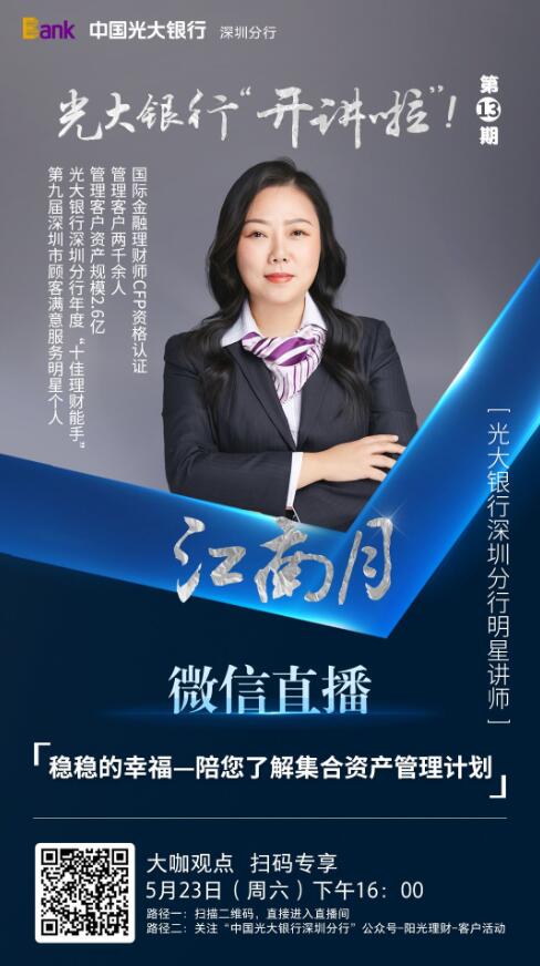 深圳新聞網(wǎng)2020年5月21日訊近日,光大銀行深圳分行將攜手《深圳晚報(bào)》于5月23日下午在線開(kāi)展第十三期《光大銀行“開(kāi)講啦”!》公益課堂。據(jù)了解,《光大銀行“開(kāi)講啦”!》是光大銀行深圳分行為客戶推出的每周線上固定公益類(lèi)講座,內(nèi)容涵蓋投資理財(cái)、市場(chǎng)分析、養(yǎng)生、文化、藝術(shù)、讀書(shū)、教育、旅游、財(cái)稅等。目前已邀前故宮博物院院長(zhǎng)單霽翔、江蘇衛(wèi)視《最強(qiáng)大腦》中國(guó)隊(duì)隊(duì)長(zhǎng)李威、前華爾街投行金融專(zhuān)家劉湘玲、匯安基金董事總經(jīng)理魏嵬等外部專(zhuān)家,聯(lián)合多位銀行內(nèi)部明星講師,一起為客戶帶來(lái)精彩課程。