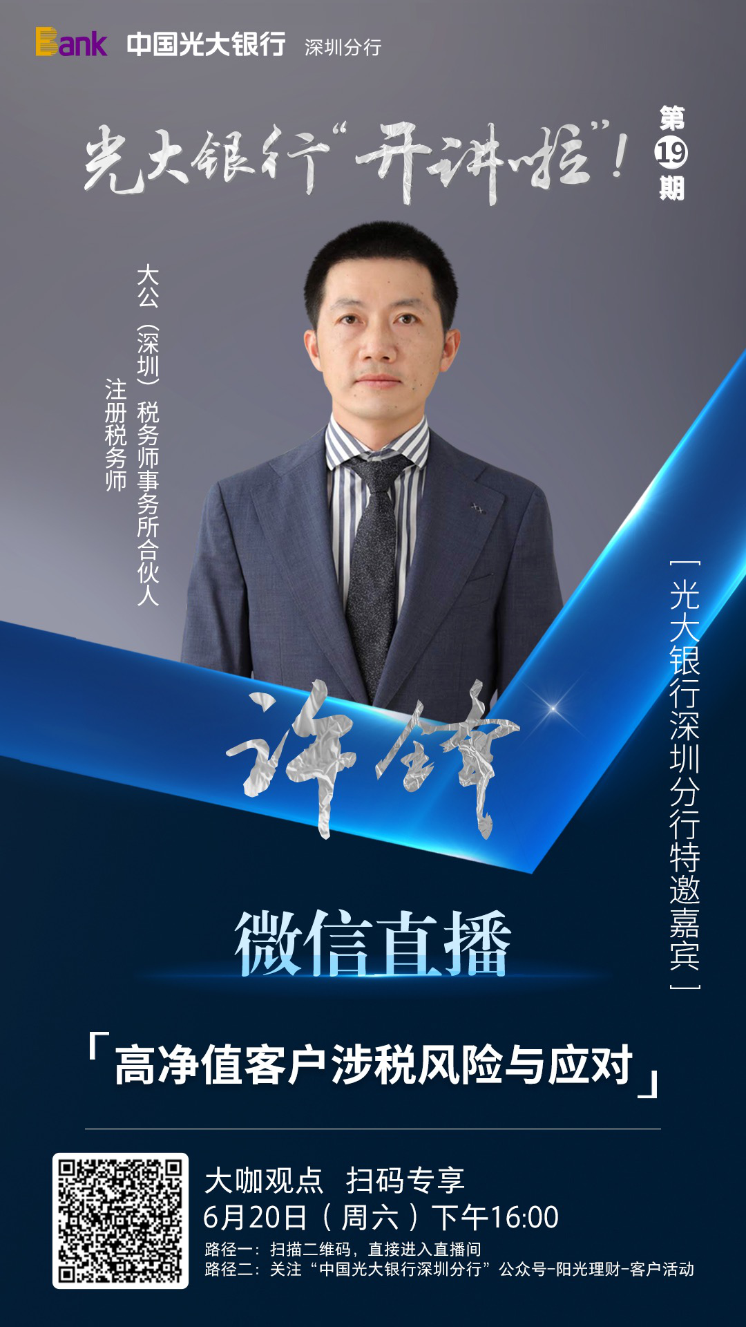此次公益課堂邀請到大公(深圳)稅務(wù)師事務(wù)所合伙人、注冊稅務(wù)師許鋒,在線為客戶開講《高凈值客戶涉稅風(fēng)險(xiǎn)與應(yīng)對》。他從當(dāng)前稅務(wù)形勢及改革方向、征管變化、企業(yè)及高凈值個(gè)人稅務(wù)管理與籌劃等幾個(gè)層面開講,深入剖析了中國稅制特點(diǎn);并列舉具體案例,結(jié)合當(dāng)前稅收管理制度與政策,講解企業(yè)高管、高凈值人群在不動(dòng)產(chǎn)投資、股權(quán)投資、公私混同的涉稅風(fēng)險(xiǎn);剖析家族企業(yè)股權(quán)傳承中的稅務(wù)規(guī)劃,如何打破“富不過三代”的魔咒,以及在CRS全面啟動(dòng)背景下,高凈值人士如何應(yīng)對?幫助提示企業(yè)及高凈值人群,在稅務(wù)管理“全監(jiān)管”的時(shí)代,早做稅務(wù)規(guī)劃,規(guī)避稅務(wù)風(fēng)險(xiǎn),做到“稅稅平安”。