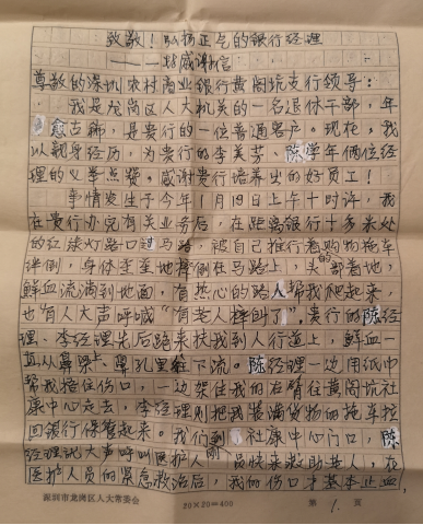 “事發(fā)第二天,該行行長又派陳學(xué)年、李美芳兩位員工到我家探望、慰問,讓我全家非常感動(dòng)?!?月29日下午,傷口剛剛拆線的老人就帶著手寫的感謝信來到深圳農(nóng)商行黃閣坑支行,向幫助過他的兩位熱心人表達(dá)感謝之情。感謝信整整三頁紙,字跡工整,老人家的誠摯感謝之意躍然紙上。