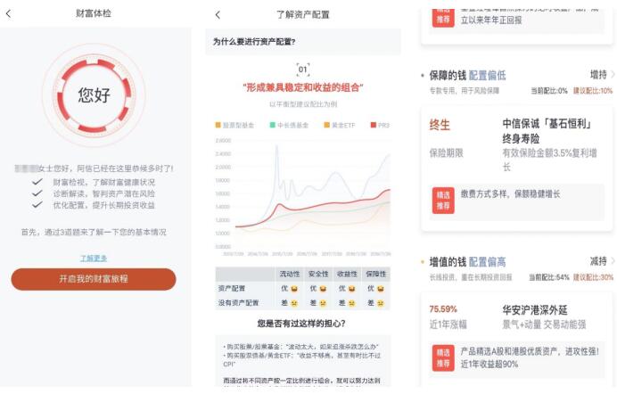 2020年8月,中信銀行的app上線了“財富體檢”功能。據(jù)介紹,這是一套基于歷史數(shù)據(jù)回測構(gòu)建財富評價的模型,可以基于客戶的財富水平、風(fēng)險偏好以及所處生命周期,動態(tài)檢視客戶財富配置狀況,并提供針對性的資產(chǎn)配置建議和產(chǎn)品推薦。