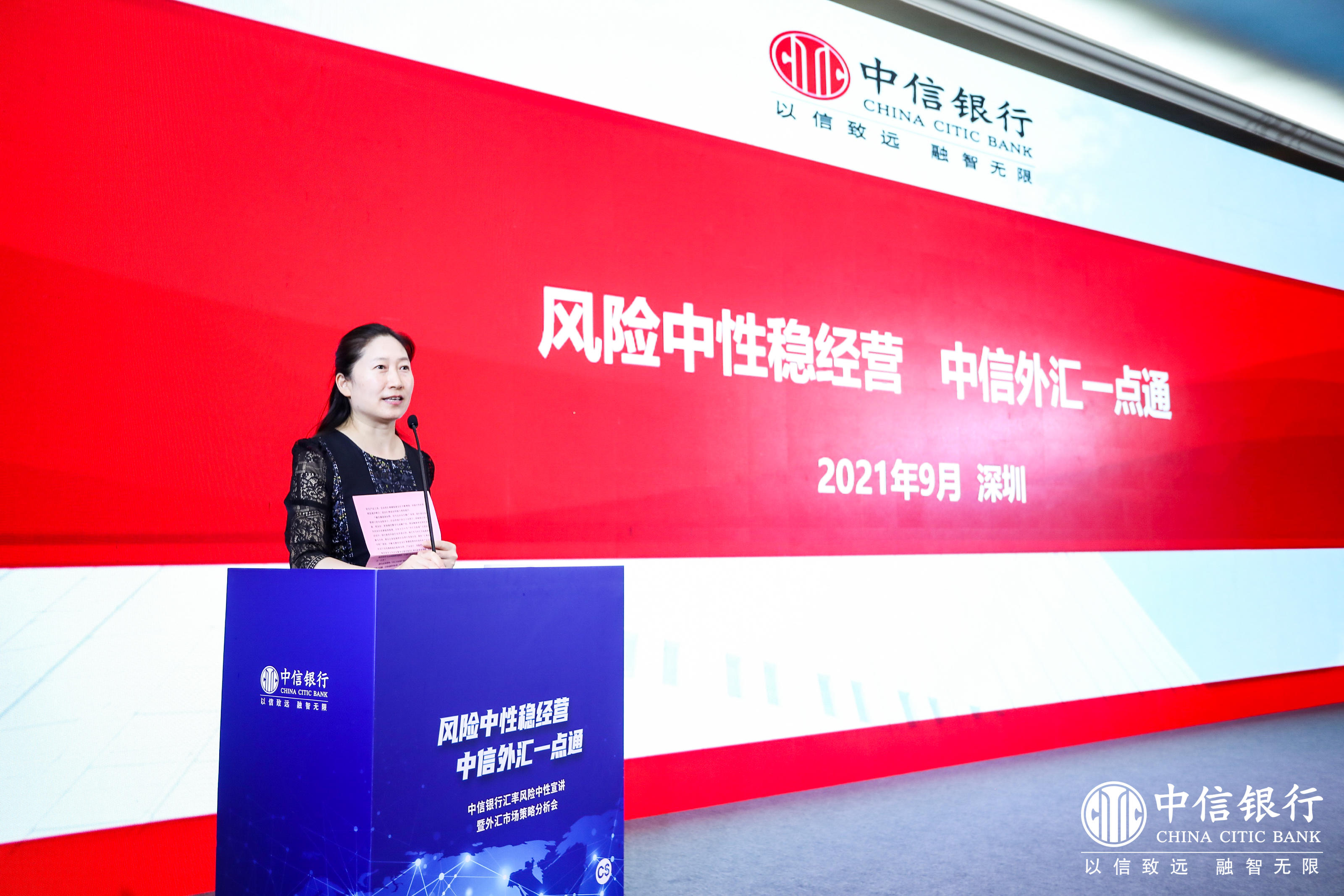 中信銀行國際業(yè)務(wù)部副總經(jīng)理顏穎做了題為《中信銀行履行匯率風(fēng)險(xiǎn)中性社會責(zé)任》的講話,向企業(yè)傳導(dǎo)了樹立和完善“風(fēng)險(xiǎn)中性穩(wěn)經(jīng)營”理念的重要性。中信銀行外匯專家則為參會企業(yè)帶來匯率市場的精彩解讀,通過追溯匯市發(fā)展、重點(diǎn)熱點(diǎn)事件解析,向企業(yè)揭示市場邏輯及隱藏風(fēng)險(xiǎn),引導(dǎo)企業(yè)充分認(rèn)識匯率風(fēng)險(xiǎn)管理的必要性。
