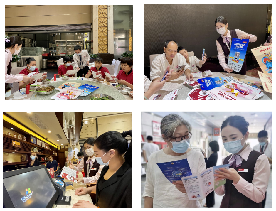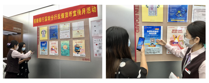 在深圳招行的各營(yíng)業(yè)網(wǎng)點(diǎn),成立了“支行守衛(wèi)隊(duì)”。依托網(wǎng)點(diǎn)優(yōu)質(zhì)設(shè)施資源,各網(wǎng)點(diǎn)通過(guò)懸掛主題宣傳橫幅、LED屏幕滾動(dòng)播放、在廳堂、等候區(qū)、柜臺(tái)等醒目位置擺放反假知識(shí)宣傳折頁(yè)和海報(bào)等方式,營(yíng)造傳統(tǒng)模式宣傳好氛圍。此外,在網(wǎng)點(diǎn)設(shè)立的營(yíng)業(yè)廳小課堂,現(xiàn)場(chǎng)講解現(xiàn)行流通人民幣的票面知識(shí)、防偽特征及識(shí)別方法;制作“2021海報(bào)答題”海報(bào)引導(dǎo)市民掃碼,開(kāi)展答題有禮的方式提高大家的參與積極性,寓教于樂(lè)開(kāi)展了反假幣知識(shí)的宣傳。