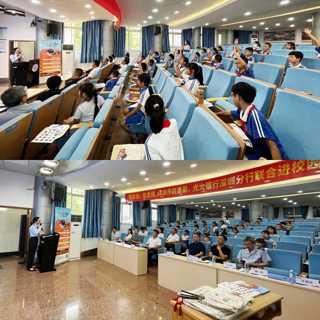 此次活動深圳市稅務局黨委與光大銀行深圳分行黨委高度重視,光大銀行深圳分行副行長、黨委委員宋綱、深圳市稅務局社會保險費處處長高鵬出席活動,旨在以2021-2022年度少兒醫(yī)保征收為契機,讓孩子們從小培養(yǎng)依法納稅、自覺參保意識,同時普及金融知識,關注青少年思想道德教育,提升金融安全防范意識,履行社會責任?;顒忧埃獯筱y行深圳分行副行長宋綱、深圳市稅務局社會保險費處處長高鵬分別對青少年送出了寄語,希望通過銀、稅、校合作,建立社保、金融知識傳輸通道,讓孩子們將稅務、社保、金融知識帶回家。