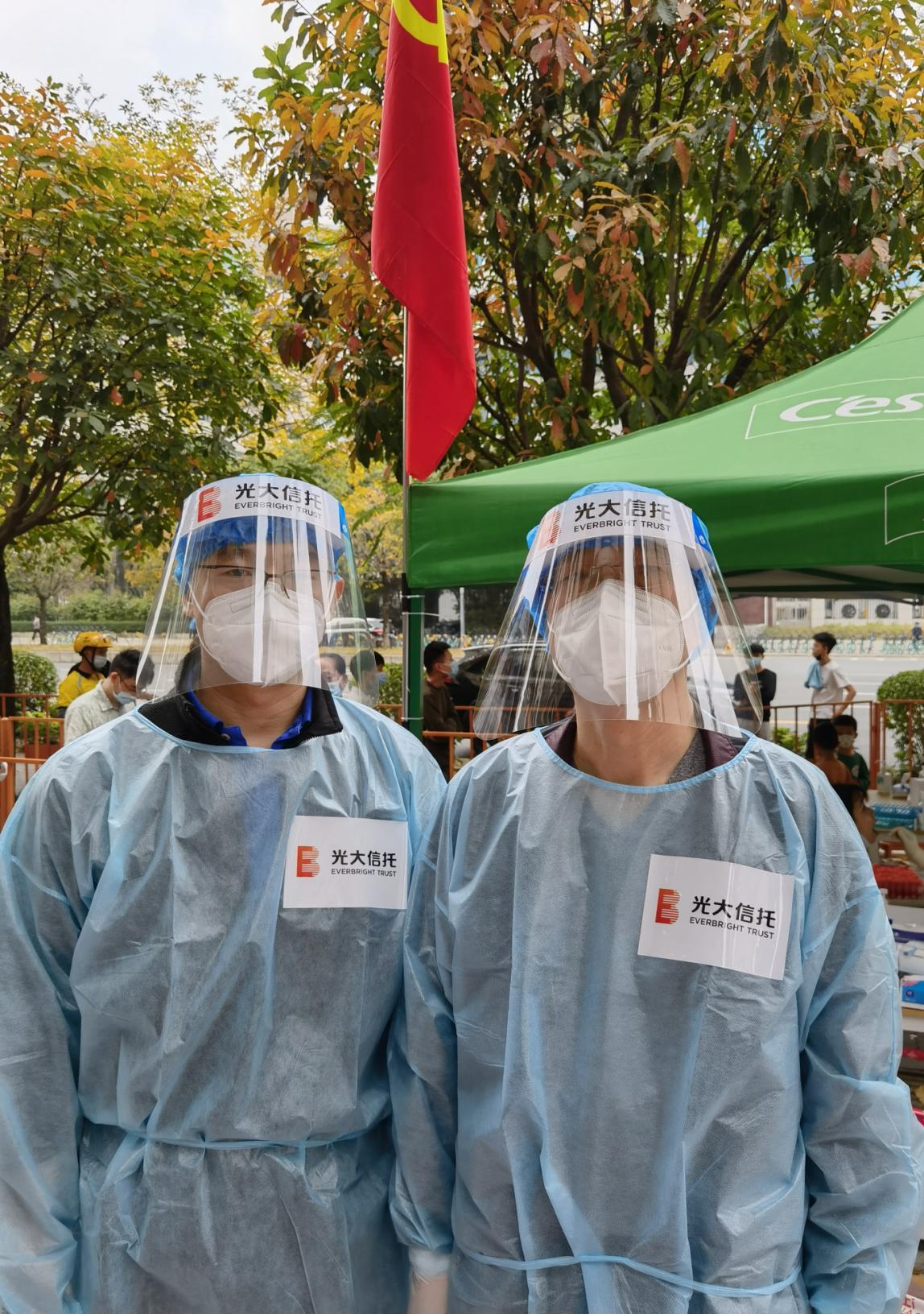 光大信托深圳區(qū)域黨支部在接到協(xié)同抗疫通知后,第一時(shí)間組織黨員和員工積極報(bào)名參與志愿服務(wù)。3月5日,恰逢毛澤東主席“向雷鋒同志學(xué)習(xí)”題詞的紀(jì)念日,光大信托公司風(fēng)險(xiǎn)總監(jiān)姚恒民同志以年近6旬的高齡,率先垂范的沖在一線(xiàn),帶領(lǐng)深圳區(qū)域黨員同志們,投入福田區(qū)蓮花街道獅嶺社區(qū)的核酸檢測(cè)志愿服務(wù)工作,用實(shí)際行動(dòng)和赤誠(chéng)情懷書(shū)寫(xiě)共產(chǎn)黨員的責(zé)任和擔(dān)當(dāng)。當(dāng)天天氣炎熱,太陽(yáng)暴曬下穿著防護(hù)服兩個(gè)小時(shí)工作下來(lái),全身已完全濕透,但他們以飽滿(mǎn)的激情、負(fù)責(zé)任的態(tài)度詮釋了一個(gè)共產(chǎn)黨員在黨旗下宣誓的誓言。光大信托的一位黨員同志說(shuō):“疫情就是命令,防控就是責(zé)任,崗位就是戰(zhàn)場(chǎng),每個(gè)服務(wù)點(diǎn)的黨旗就是一種信仰,每個(gè)黨員就是一面旗幟,每個(gè)黨支部就是一個(gè)堡壘,哪里有需要,哪里就有光大人的身影。”