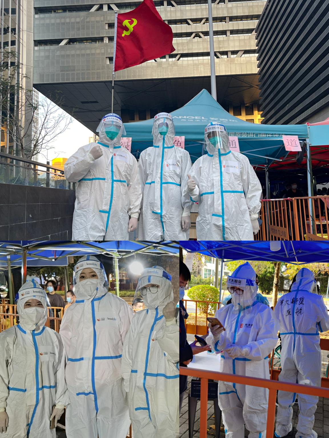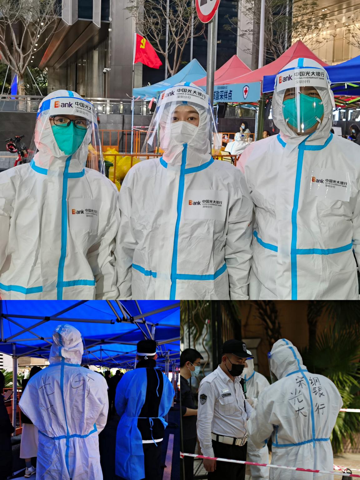 在疫情防控的關(guān)鍵時(shí)期,深圳分行黨委堅(jiān)決貫徹落實(shí)當(dāng)?shù)卣姆揽匾?,分行黨委書(shū)記、行長(zhǎng)韓學(xué)智同志緊急召開(kāi)黨委會(huì)議,啟動(dòng)應(yīng)急預(yù)案,積極部署并投入疫情防控工作,確保日常營(yíng)運(yùn)和客戶(hù)服務(wù)等工作有序運(yùn)轉(zhuǎn)。在深圳福田區(qū)金融工作局的組織與號(hào)召下,分行黨委要求全體黨員干部發(fā)揮先鋒模范作用,主動(dòng)為社區(qū)疫情防控工作提供志愿服務(wù)。分行黨委委員們率先垂范,分頭帶領(lǐng)黨員干部奔赴社區(qū)慰問(wèn)抗戰(zhàn)一線(xiàn)工作人員,并犧牲周末休息時(shí)間深入社區(qū)核酸采樣點(diǎn),脫下西裝變身“大白”。深圳分行各黨支部和團(tuán)支部先后組織開(kāi)展各類(lèi)志愿服務(wù)累計(jì)時(shí)長(zhǎng)超過(guò)100小時(shí),活躍在防疫抗疫一線(xiàn)的同志們?cè)谌ΡU蠌V大群眾金融服務(wù)需求的同時(shí),和醫(yī)護(hù)工作者一同守護(hù)著千家萬(wàn)戶(hù)。作為集團(tuán)駐深企業(yè)協(xié)同工作的牽頭單位,分行牽頭組建駐深企業(yè)志愿者先鋒隊(duì),緊急投身福田區(qū)抗擊疫情的各個(gè)戰(zhàn)線(xiàn)和各個(gè)角落,不分晝夜、不論疲倦、以實(shí)際行動(dòng)踐行初心、使命和擔(dān)當(dāng),弘揚(yáng)新時(shí)代共產(chǎn)黨人的奉獻(xiàn)精神?!叭绻皇怯H身體驗(yàn)志愿者服務(wù)工作,永遠(yuǎn)不知道抗疫人員的工作是如此辛苦!有多少人在負(fù)重前行才確保了深圳市民有序和安寧的生活。此刻很想擁抱可親可敬的你們,防護(hù)服雖然阻擋了我們的擁抱,但無(wú)法阻擋我們一起抗擊疫情的心?!币晃恢驹刚哌@樣記錄到。