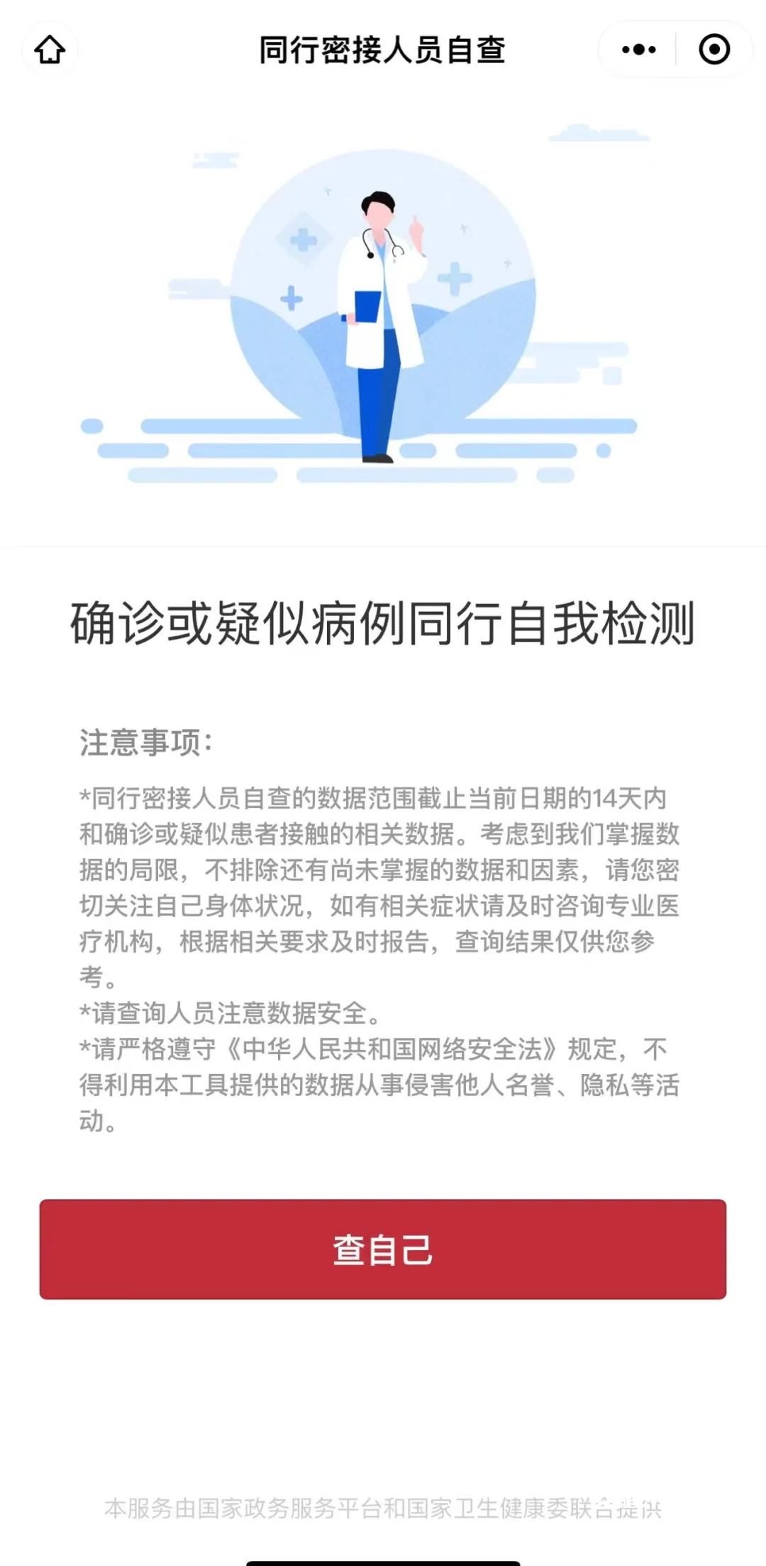 同行自查服務(wù)由國家政務(wù)服務(wù)平臺(tái)和衛(wèi)健委聯(lián)合提供,14天內(nèi)乘坐過飛機(jī)或者火車等公共交通工具出行的市民可掃描下方二維碼進(jìn)行查詢。