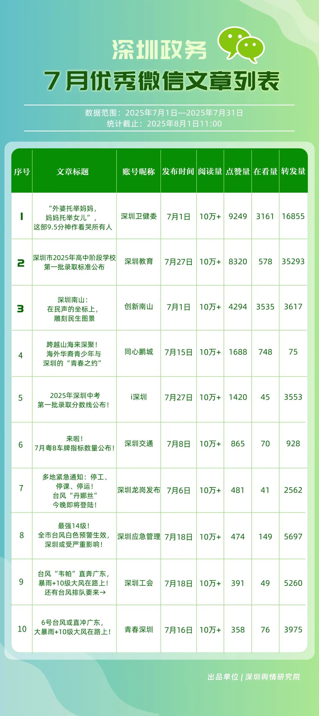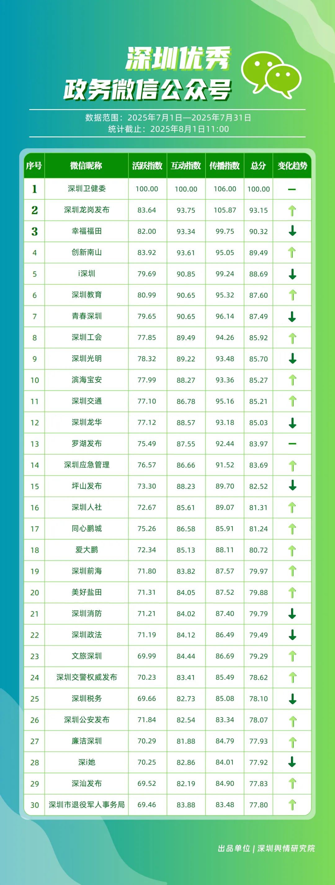 7月,30個(gè)政務(wù)微信公眾號入選“深圳優(yōu)秀政務(wù)微信公眾號”榜單,其中包括“深圳衛(wèi)健委”“深圳龍崗發(fā)布”“幸福福田”“創(chuàng)新南山”“i深圳”“深圳教育”“青春深圳”“深圳工會”“深圳光明”“濱海寶安”等。7月,“深圳衛(wèi)健委”內(nèi)容專業(yè)性與傳播力優(yōu)勢穩(wěn)固,整體表現(xiàn)保持較高水平,位于榜首;“深圳龍崗發(fā)布”聚焦民生服務(wù)與區(qū)域活動(dòng)宣傳,實(shí)現(xiàn)傳播效果提升,位居第二;“幸福福田”表現(xiàn)同樣不俗,排名第三?!皠?chuàng)新南山”“深圳教育”“深圳工會”等也積極發(fā)布高質(zhì)量信息與服務(wù)內(nèi)容,能夠較好平衡內(nèi)容“質(zhì)”與“量”,排名有所提升。上榜微信公眾號依托特色優(yōu)勢深耕內(nèi)容創(chuàng)作,將優(yōu)質(zhì)內(nèi)容作為核心支撐,成為政務(wù)傳播領(lǐng)域的優(yōu)秀典范。