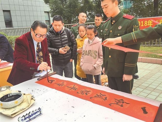 當(dāng)日,來到現(xiàn)場(chǎng)的書畫家有林明川、葉自力、黃漢明、劉振海、賴福豪、唐伯龍、葉生茂、鄧日龍、陳思羽9位,由于桌子數(shù)量有限,書畫家們還輪流上場(chǎng),搞起了“筆墨接力”。前來圍觀、求字求畫的官兵以及家屬們絡(luò)繹不絕。最受歡迎的是題寫“?!弊趾痛郝?lián)。臨近春節(jié),大家都想求一個(gè)好意頭。書畫家們對(duì)官兵、家屬們的要求,來者不拒,全情滿足。