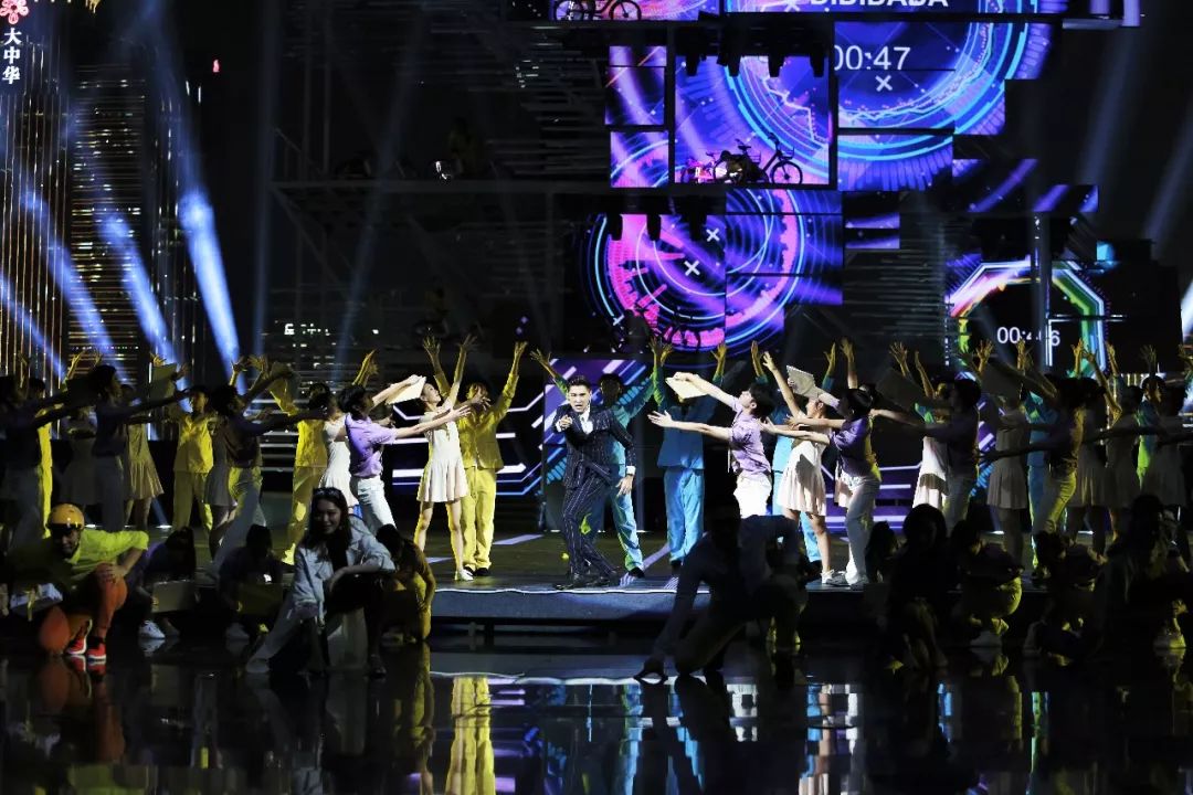 在本場晚會上,為了響應(yīng)“追夢”主題,李盾聯(lián)合百 老匯頂級音樂劇導(dǎo)演卓依·馬可尼利、國際著名作曲家阿鯤,著名作詞家梁芒為晚會創(chuàng)作了一段音樂劇形式的節(jié)目《嘀嘀嗒嗒》。作為節(jié)目的重心,主創(chuàng)團(tuán)隊(duì)在劇中融入了原創(chuàng)音樂劇《深南大道》的主題曲《新的一天》選段。內(nèi)容以深圳每一個上班族的工作和生活作為出發(fā)點(diǎn),以音樂劇的形式設(shè)計(jì)了如秘書、創(chuàng)業(yè)者、設(shè)計(jì)師、程序員、義工和銷售等等不同的角色,年輕的演員、動聽的旋律、跌宕的劇情、新穎的節(jié)奏,點(diǎn)燃了現(xiàn)場觀眾的熱情。精彩的表演配合晚會場地絢爛激情的燈光秀,以及舞臺中心十多米高被命名為“追夢人”的LED裝置,不時更換相應(yīng)的場景多媒體,整體形成如夢幻般的光影效果。