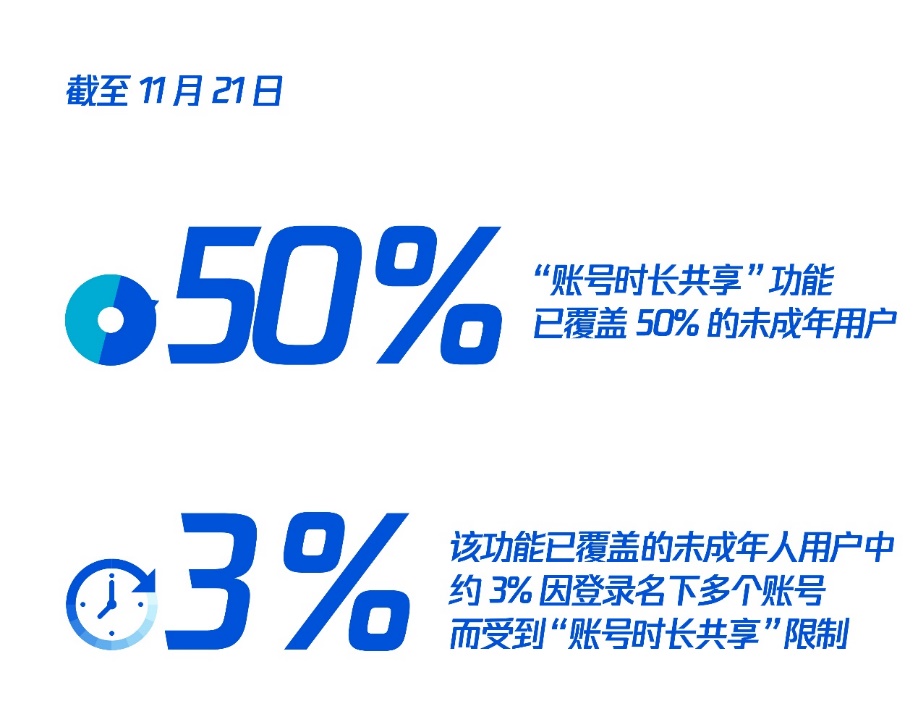 11月15日在《王者榮耀》啟用的“賬號時長共享”功能,基于自然人身份對未成年用戶名下賬號的總游戲時長進行合并計算,目前正在逐步發(fā)揮效力。