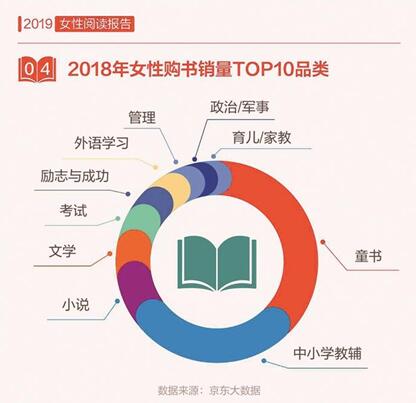 京東大數(shù)據(jù)顯示,女性的讀書(shū)量顯著提升,2018年,女性讀者人均購(gòu)書(shū)7.6本,高于男性,女性讀者在紙質(zhì)書(shū)購(gòu)買上的人均消費(fèi)近230元,女性的“閱讀力”正在變得越來(lái)越強(qiáng)。從圖書(shū)銷量上看,2018年女性讀者購(gòu)買最多的圖書(shū)是童書(shū)、中小學(xué)教輔、小說(shuō)、文學(xué)和考試,可見(jiàn)對(duì)于大部分女性而言,購(gòu)書(shū)的主要目的是出于育兒的需求。