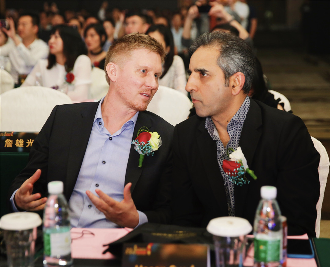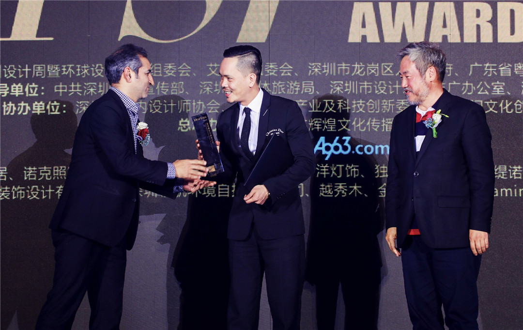 △中央美術學院建筑設計研究院院長、博士生導師王鐵,美國Gensler上海公司總監(jiān)Hasan Syed為廣州設計師黃永才頒發(fā)“最佳娛樂空間設計獎”