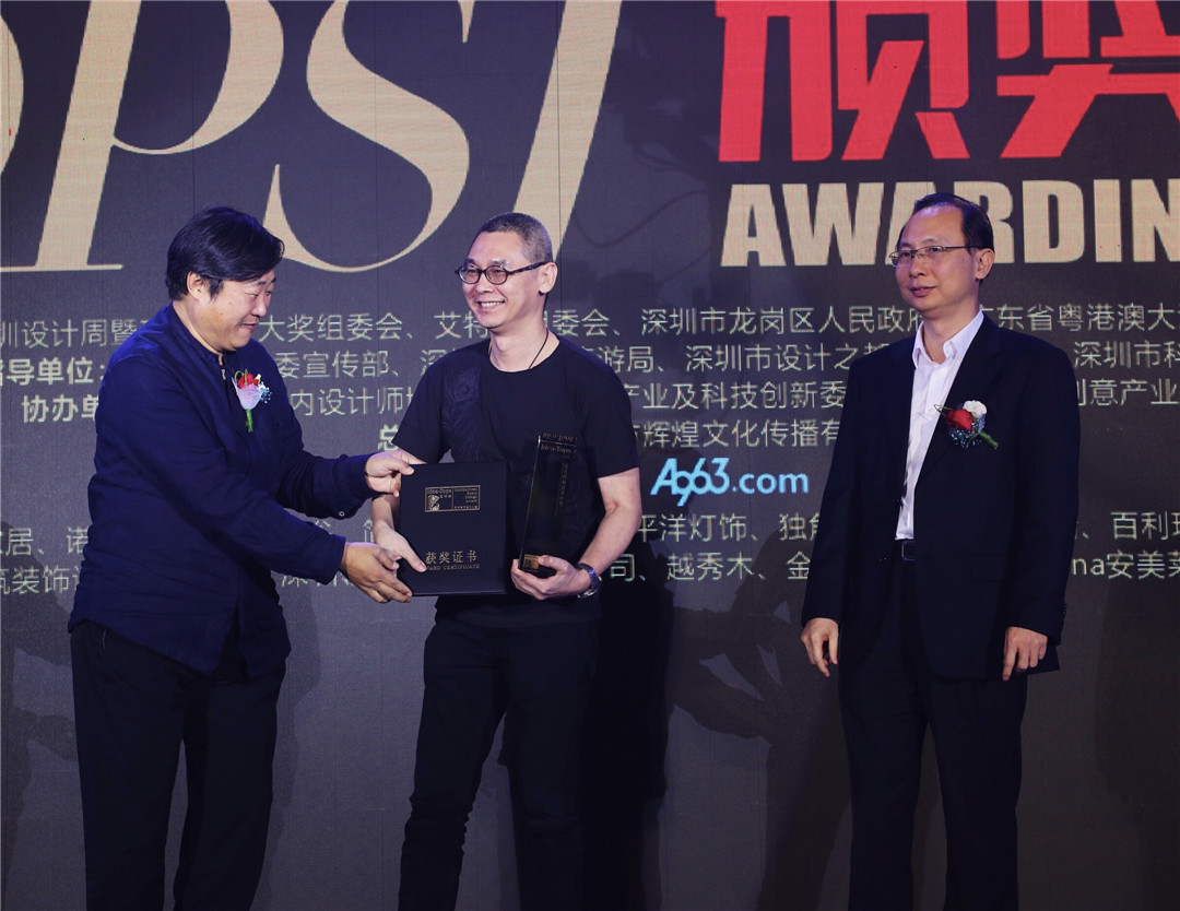 △深圳市政協(xié)提案委員會副巡視員魏威與清華大學美術學院博士生導師張月、為上海黑泡泡建筑裝飾設計工程有限公司設計師代表頒發(fā)“最佳會所設計獎”
