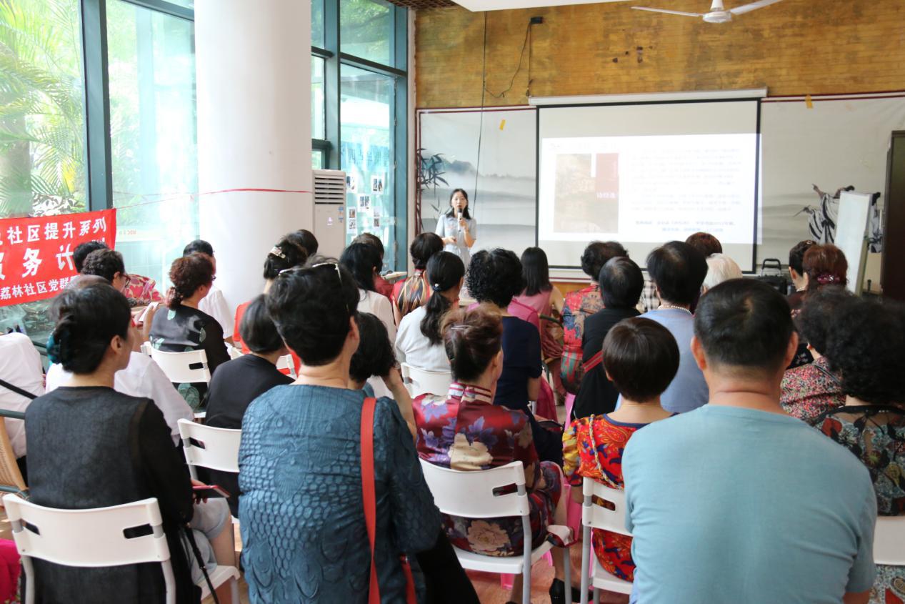 “綠草蒼蒼,白霧茫茫,有位佳人,在水一方。綠草萋萋,白霧迷離,有位佳人,靠水而居......”講座開始,邵洋吟唱起鄧麗君的《在水一方》,引得居民朋友輕聲相和,歌聲悠遠而綿長。