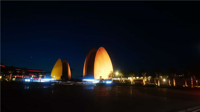 入夜,鳳凰灣地標建筑貝殼劇院格外醒目