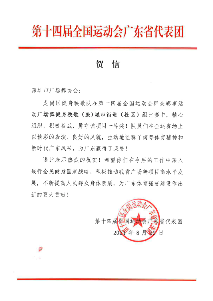 8月29日,第十四屆全國運動會群眾展演廣場舞健身秧歌(鼓)項目公布競賽結(jié)果,由深圳市文化廣電旅游體育局和深圳市廣場舞協(xié)會組織代表廣東省參賽的隊伍,以一套整齊劃一、剛?cè)岵淖赃x套路《我的祖國》戰(zhàn)勝了多個省市的傳統(tǒng)秧歌強隊,得到最高名次,獲得了含金量十足的城市街道(社區(qū))組一等獎。
