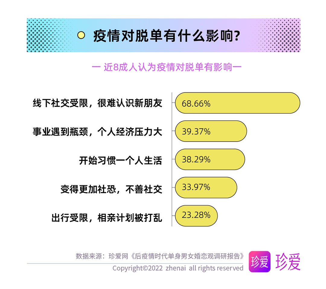 多數(shù)人都更渴望愛情,但疫情也對脫單進(jìn)程產(chǎn)生了一定影響。報告顯示,近八成人認(rèn)為疫情對脫單有影響,其中首要影響為線下社交減少導(dǎo)致很難認(rèn)識新朋友(68.66%),其次為日常出行受限因此相親計劃被打亂(39.37%),此外還有開始習(xí)慣一個人生活、事業(yè)遇到瓶頸導(dǎo)致的個人經(jīng)濟(jì)壓力大、更加“社恐”等影響。