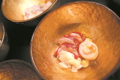 頭盤 “荷塘魚趣”,主角黃花魚來自世界第三大江——長江。步步生蓮是東方禪意,蓮子依依是情誼,蓮藕結結是路路通達,Alvin Leung此次演繹的中式料理充滿東方元素,表達的是和諧交融。主菜“日式鮮味香烤和?!笔侨毡局鲝NHisamitsu Hataji 之作,他用創(chuàng)新手法融入經典的日式料理中,表達一年四季食材與味道的關系,這是關于美食的光陰的故事。甜品出自Clement之手,是晚宴甜蜜的句號。
