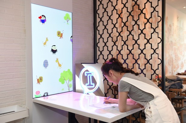 餐廳中心區(qū)域設(shè)置了一款風(fēng)靡全球的“奇妙涂鴉”互動(dòng)游戲,只需用蠟筆或微信小程序涂鴉,就能親眼見證自己填色的靜態(tài)畫像活靈活現(xiàn)地走入桌面走上墻壁,人人均可當(dāng)一回“神筆馬良”,用創(chuàng)意打開無限想象,邊吃邊玩,將用餐變成一種愉悅的享受。